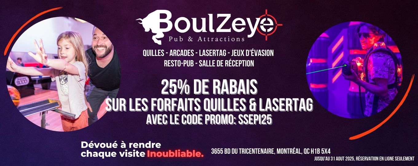 De plus, le BoulZeye vous propose une offre promotionnelle, soit 25 % de rabais applicable lors d’une réservation en ligne pour les activités de quilles et de laser tag jusqu’au début septembre 2025.